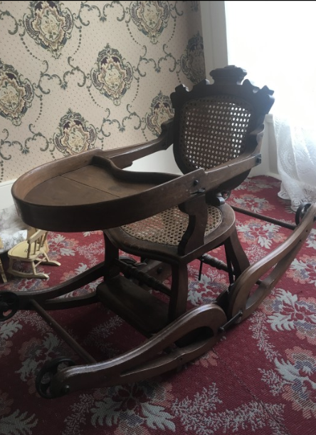 Eastlake style walnut high chair on metal wheels with caned seat. The high chair legs pivot to become rocking chair rails. This piece likely would have had its home in the Cochran family kitchen after the 1900 addition was completed. The Cochran Collection, Unknown Donor.