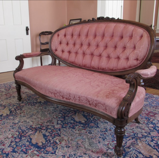 Victorian Louis XVI– Style Revival walnut sofa features an oval upholstered back topped by a carved floral motif on turned and tapered legs. It uses neoclassic elements like simple legs to create a light appearance. Gift of Mrs Marshall O. Bell.