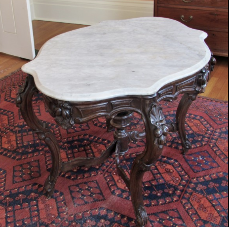 Victorian Rococo Revival mahogany center table with characteristic frame heavily carved with elaborate floral sprays and cartouches, having a white marble “turtle-top.” Center tables were a focal point of the formal parlor; the name refers to decoration on all four sides; a large oil or kerosene lamp often stood on these tables. Unknown Donor.