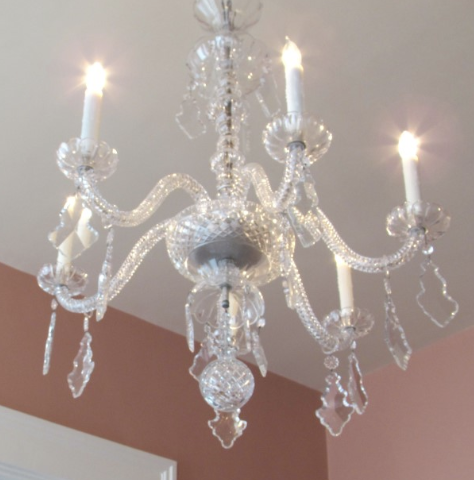 Chandelier made of collected parts, 20th century with older parts, leaded glass arms and drops. Compare this chandelier with the one in the Front Parlor and note the differences – and also note the quality of the lozenge-shaped drops handing from the arms. Gift of Mrs. W. C. Winter.