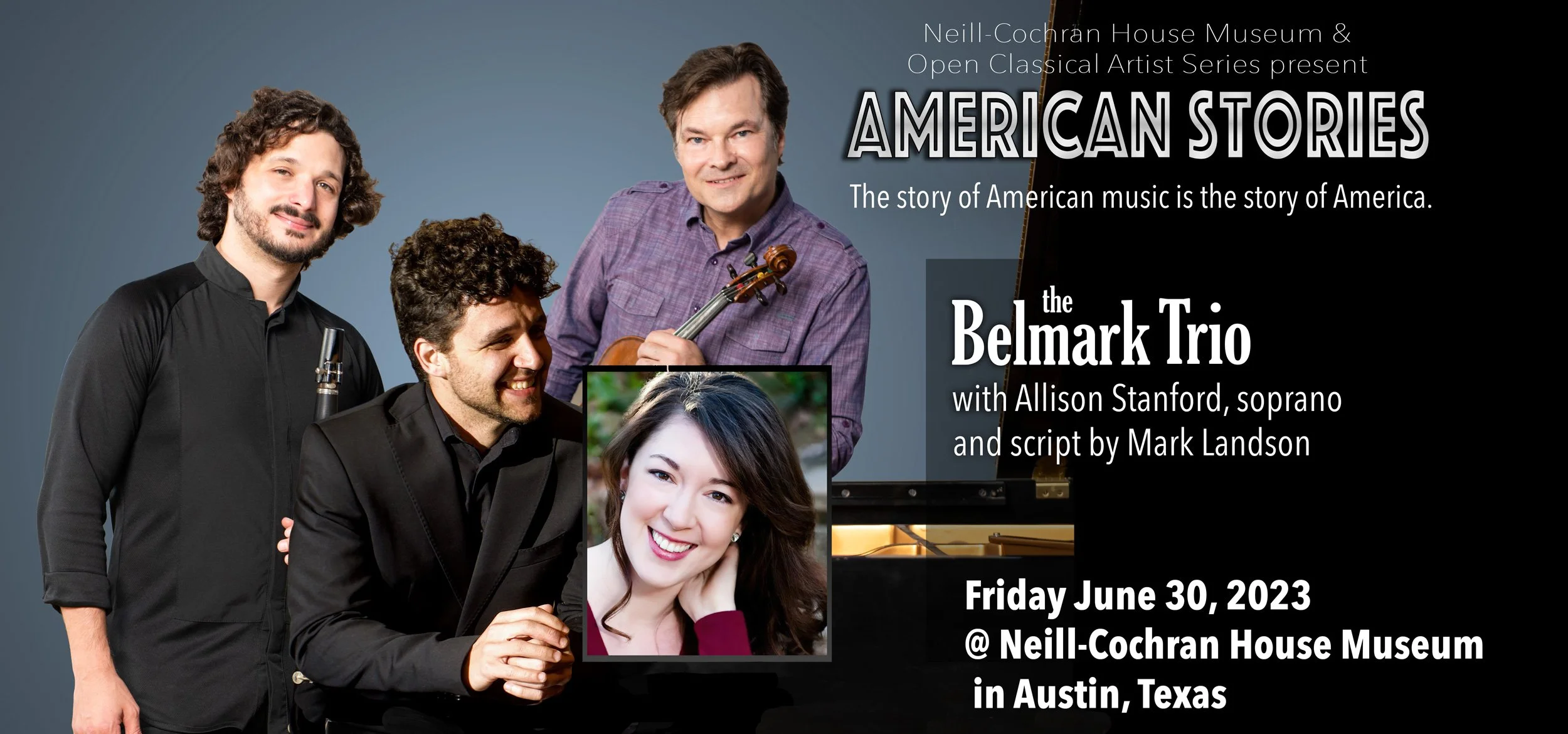 Mark Landson’s American Stories is a rousing exploration of American patriotic music and the stories of American composers from independence through modern times. American greats Stephen Foster, Scott Joplin, George M Cohan, Gershwin, Copland, Bernstein and more come to life through the unique storytelling and comedy of Mark Landson and the musicianship of the Belmark Trio (clarinetist Brent Buemi, pianist Darío Llanos Javier, and violinist Mark Landson), joined by the brilliant soprano vocalist Allison Stanford, winner of the 2022 Latin American and Iberian Art Song Competition in Barcelona.