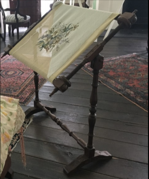 Walnut tapestry screen, used to stretch out textiles to work on larger needlepoint pieces. Signed and dated on the bottom of the leg by Peter Mansbendel, a prominent Austin woodworker. The pre-worked needlework is a reproduction of a period design (pre worked patterns were very popular during this time period). Colonial Dames member Vereen Woodward stitched the wool background in 2016. Estate of Virginia Woodward Houghton, 2007.